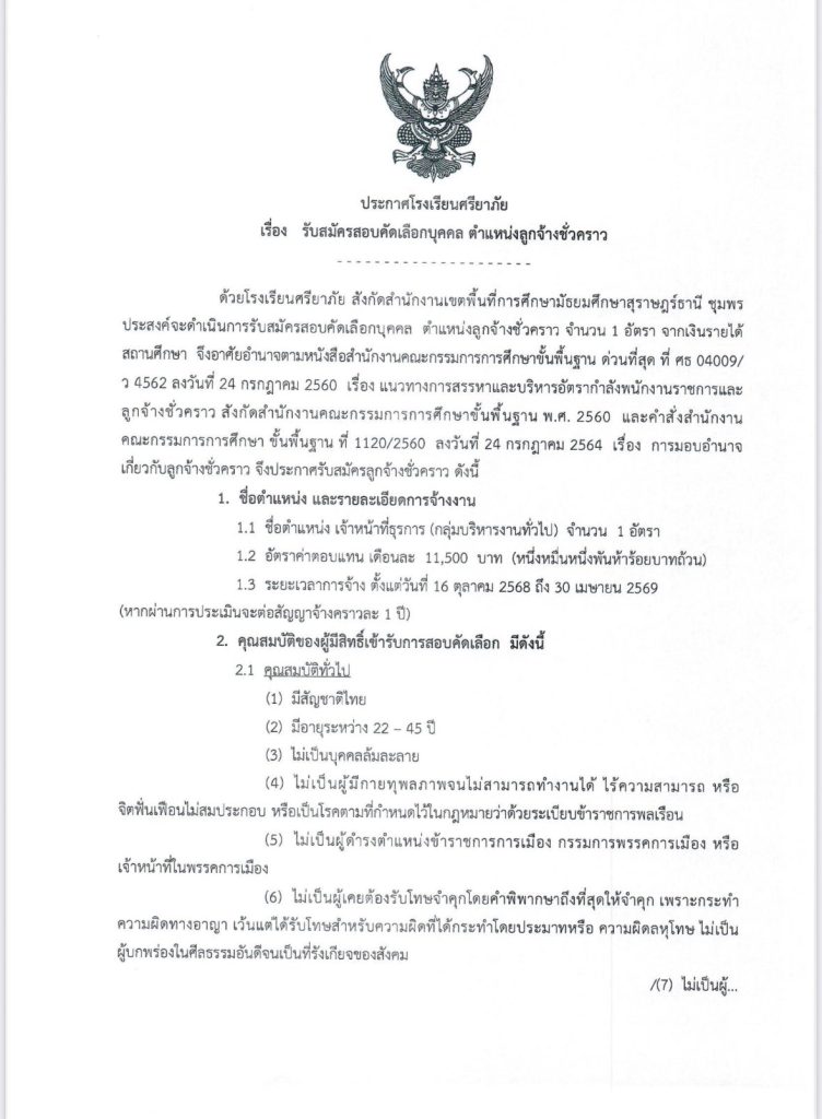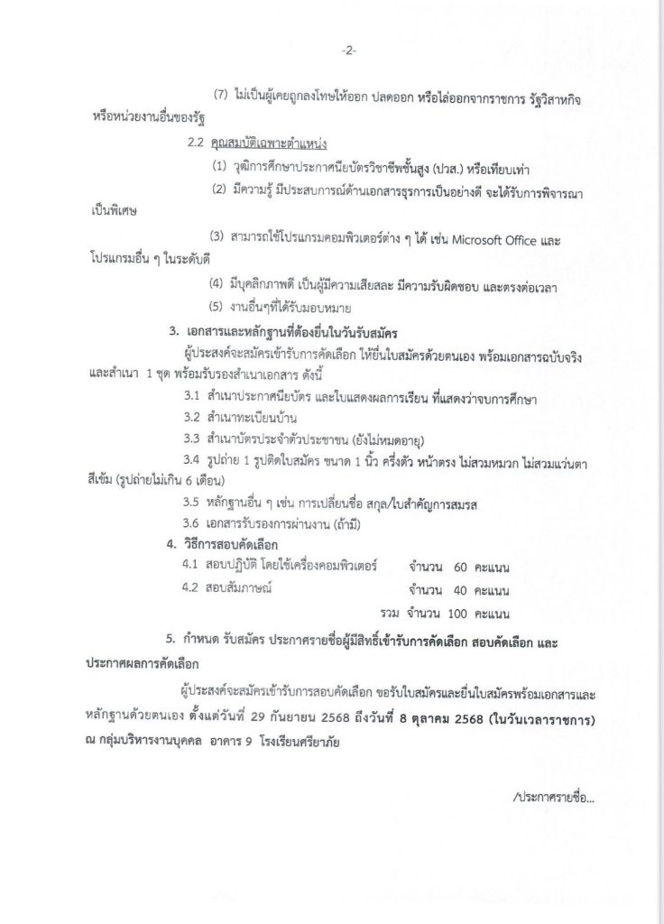 ประกาศ เรื่อง รับสมัครสอบคัดเลือกบุคคล ตำแหน่งลูกจ้างชั่วคราว จำนวน 1 อัตรา เจ้าหน้าที่ธุรการ กลุ่มบริหารทั่วไปadmin_wp25/09/2025ข่าวประชาสัมพันธ์ Post Views: 32 Previous Post ประกาศ เรื่อง สมัครสอบคัดเลือกลูกจ้างชั่วคราว ตำแหน่งช่างประจำอาคาร (ช่างแอร์)
